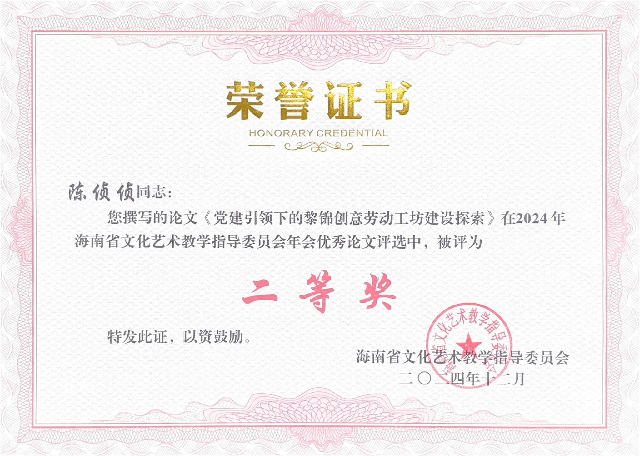 近日,海经贸人艺匠心工作室传来喜讯,该工作室党员陈侦侦撰写的论文《党建引领下的黎锦创意劳动工坊建设探索》在2024年海南省文化艺术指导委员会年会优秀论文评选中脱颖而出,荣获二等奖!