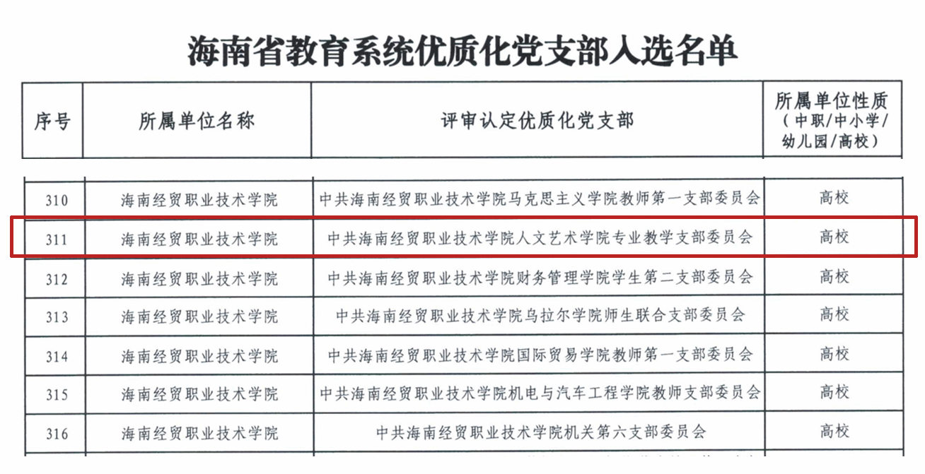 近日,中共海南省委教育工作委员会正式公布了全省教育系统优质化党支部入选名单,海南经贸职业技术学院收获佳绩,共有7个党支部成功入选,其中英国上市公司365专业教学党支部榜上有名,此外还包括马克思主义学院教师第一党支部、财务管理学院学生第二党支部、乌拉尔学院师生联合党支部、国际贸易学院教师第一党支部、机电与汽车工程学院教师党支部以及机关第六党支部。