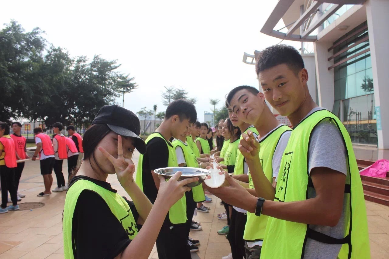 户外素质拓展培训由校外教练进行培训,培训分为上午、下午两个时间段进行。分别为上午四个游戏,下午四个游戏。培训开始首先进行抓手指游戏,以此锻炼同学们的反应能力。之后将80多名学生干部进行分组,分为4个小队,小队自行想队名和口号。教练以每个小队完成任务的时间长短的方式来决定名次,获得第一名的可以不用做俯卧撑,第二名做十个,第三名十五个,第四名二十个。这更加激发了同学们勇夺第一的信念。上午的趣味游戏项目有“抓手指”、“坐地起身”、“解手链”。第一个“抓手指”游戏让每个同学打破了陌生的尴尬,建立了足够的信任和依赖,让后面的游戏都游刃有余,合作得格外默契。尤其是在“坐地起身”游戏中,同学们的默契度更上一层楼。而上午的最后一个游戏“坐人椅”更是让同学们团结起来。下午则设置了“精神集中”“翻叶子”“水到渠成”“十人九足”等游戏。在“翻叶子”“水到渠成”和“十人九足”中,同学们都需要团结合作,考虑他人,改变自己,虽然冒着炎热的太阳,但我们比赛中的同学们依然坚持不懈把第一名作为目标努力着。