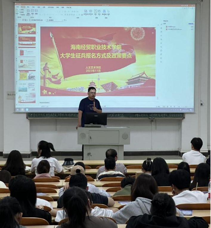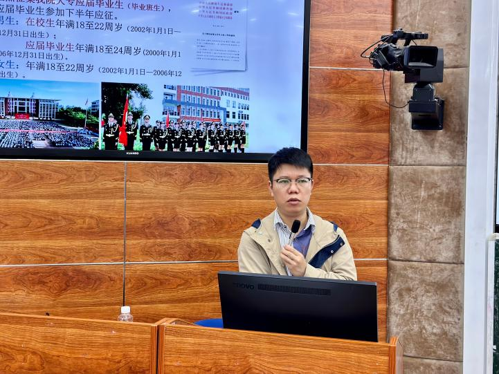 宣讲会上,李圣和雷走宏老师分别给21-23级同学们上了一堂生动的国防教育及征兵宣讲课,对大学生入伍标准、要求、流程进行了详细说明,并从学业支持、经济补助以及职业发展等优待政策进行了详细解读,号召和鼓励同学们积极应征入伍、投身军营,在祖国需要的地方奉献自己的力量。老师们的讲解进一步加深了同学们对征兵政策的了解,增强了同学们的国防意识和参军报国热情。
