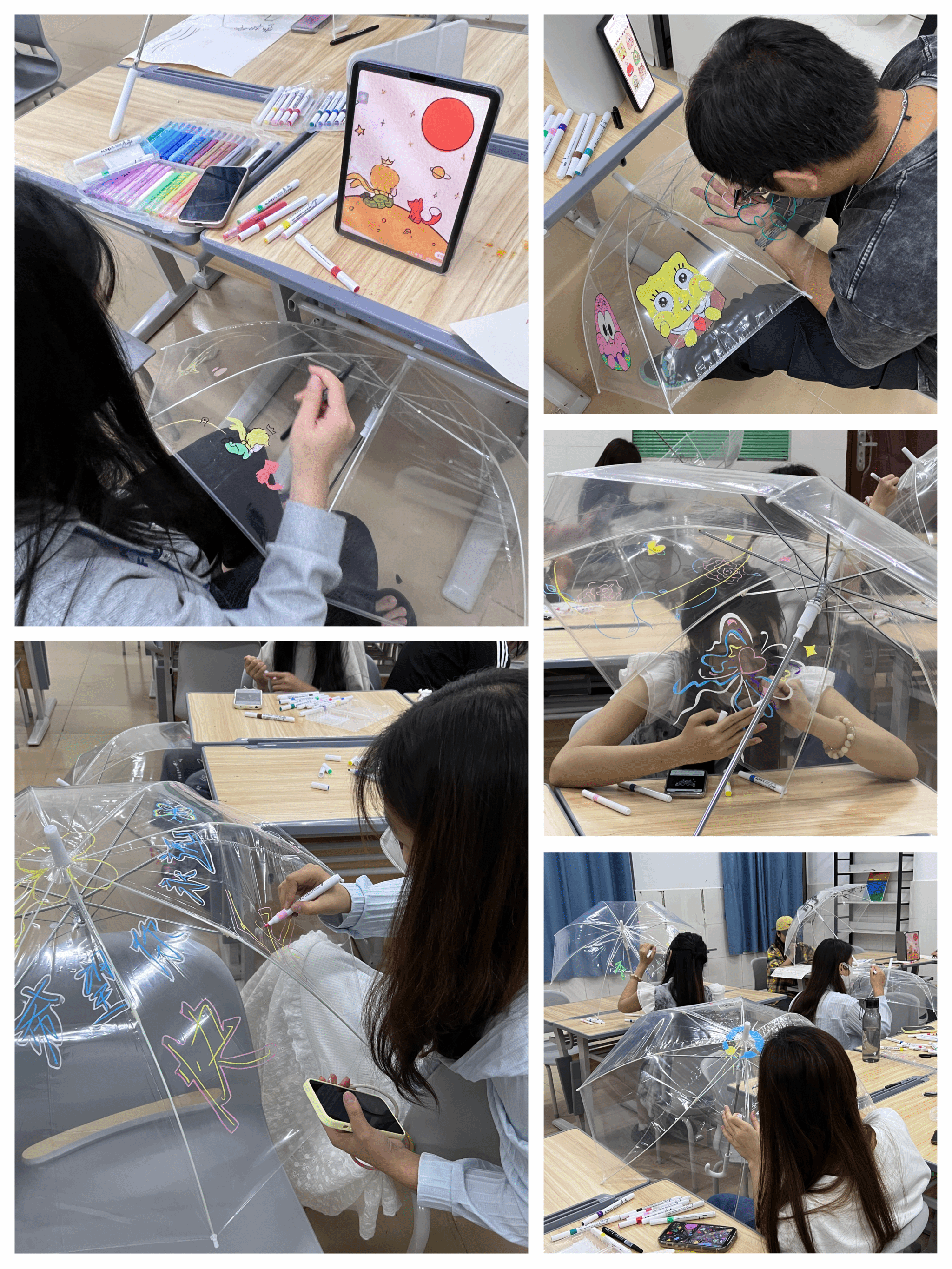 活动中,同学们用生动的笔触在雨伞上描绘成长的烦恼、日常生活的所思所感、写下自己的心愿,用以释放内心的压力和情感,展示自我的独特风格。爱情、生活、向往、愿望、自我成长等主题都跳跃伞上。在DIY过程中,大家将注意力转移到创作上,忘记烦恼和压力,积极交流,互相探讨心得和技巧,分享作品和经验,建立联系和友谊。
