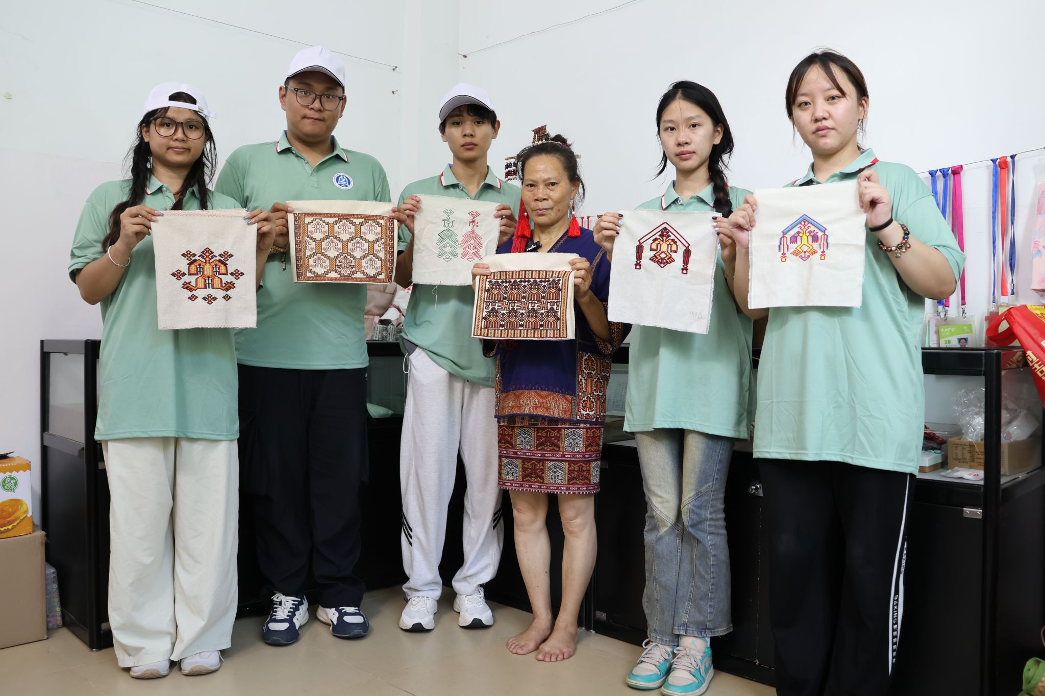 王瑞妹老师以其深厚的文化底蕴和精湛的技艺,亲自向同学们传授了黎族纺、染、织、绣的古老技艺。在王老师耐心的指导下,同学们不仅掌握了纺线的细腻、染色的奥妙、织布的韵律和绣花的灵动,更深刻体会到了这些技艺背后所蕴含的匠心精神与文化价值。通过亲手操作,他们感受到了非遗技艺的独特魅力,也更加坚定了传承与创新的信念。