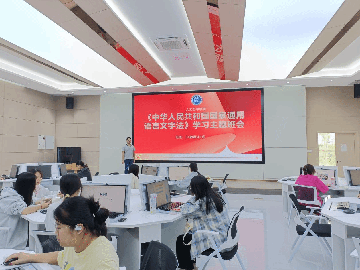 一是组织全体2024级共15个班级开展《中华人民共和国国家通用语言文字法》学习主题班会,引导同学们树立正确的语言观,认真审视自己的网络言行,杜绝不规范用语,正确使用网络语言文字,发挥网络语言的积极作用,避免滥用和误用,提升自身语言文字的使用水平。