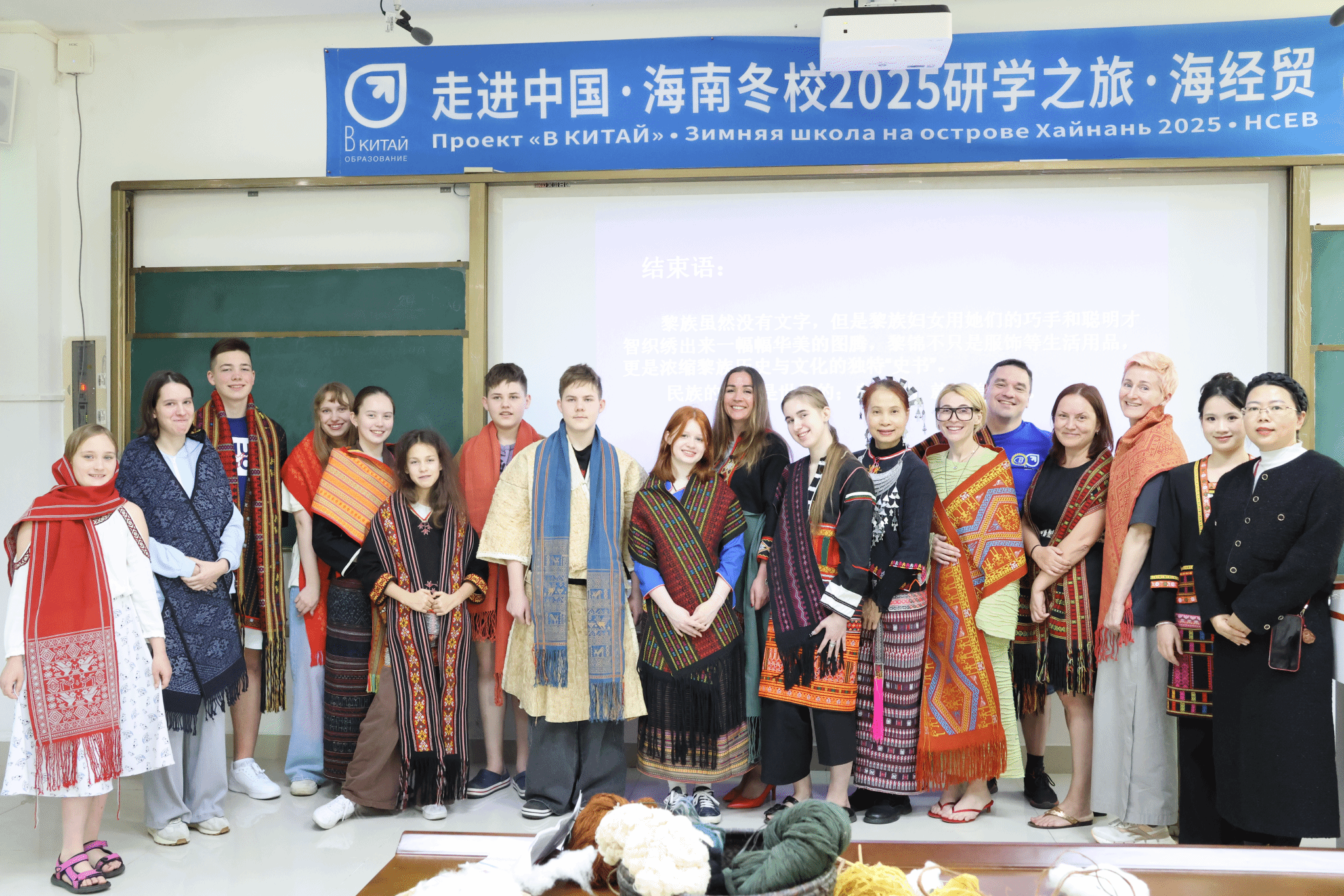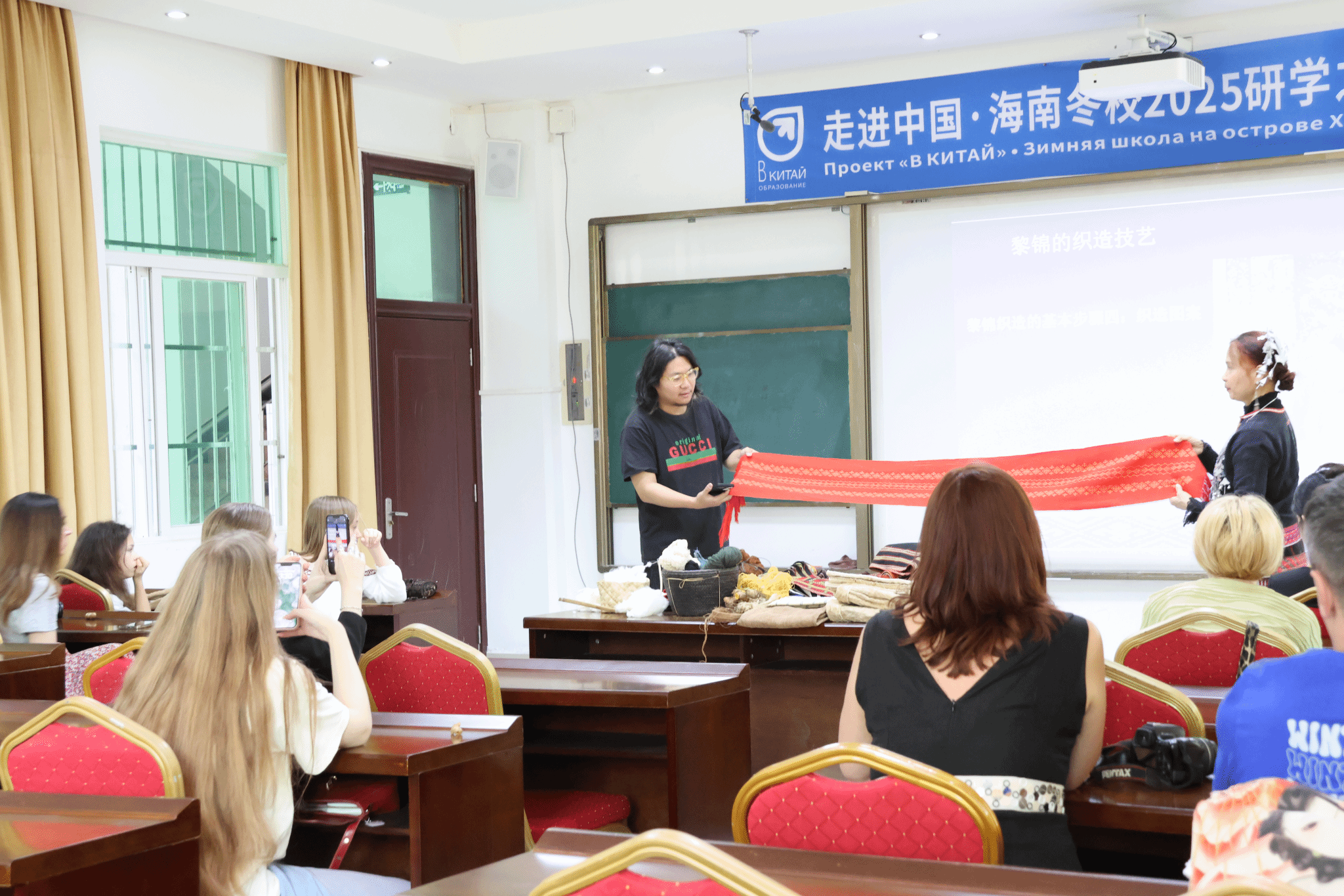 本次活动得到了海南省非物质文化传承人、南海工匠陈丹老师的鼎力支持。陈丹老师以其深厚的学识和精湛的技艺,向国际学员们全面介绍了非遗黎锦文化的丰富内涵。从黎锦的原材料选取、纺线、染色、织布、刺绣技艺,到树皮衣的制作、海南黎族五大方言服饰的特色、图案的寓意、龙被的传奇,陈丹老师娓娓道来,让国际学员们对黎锦文化有了更加深入的了解。