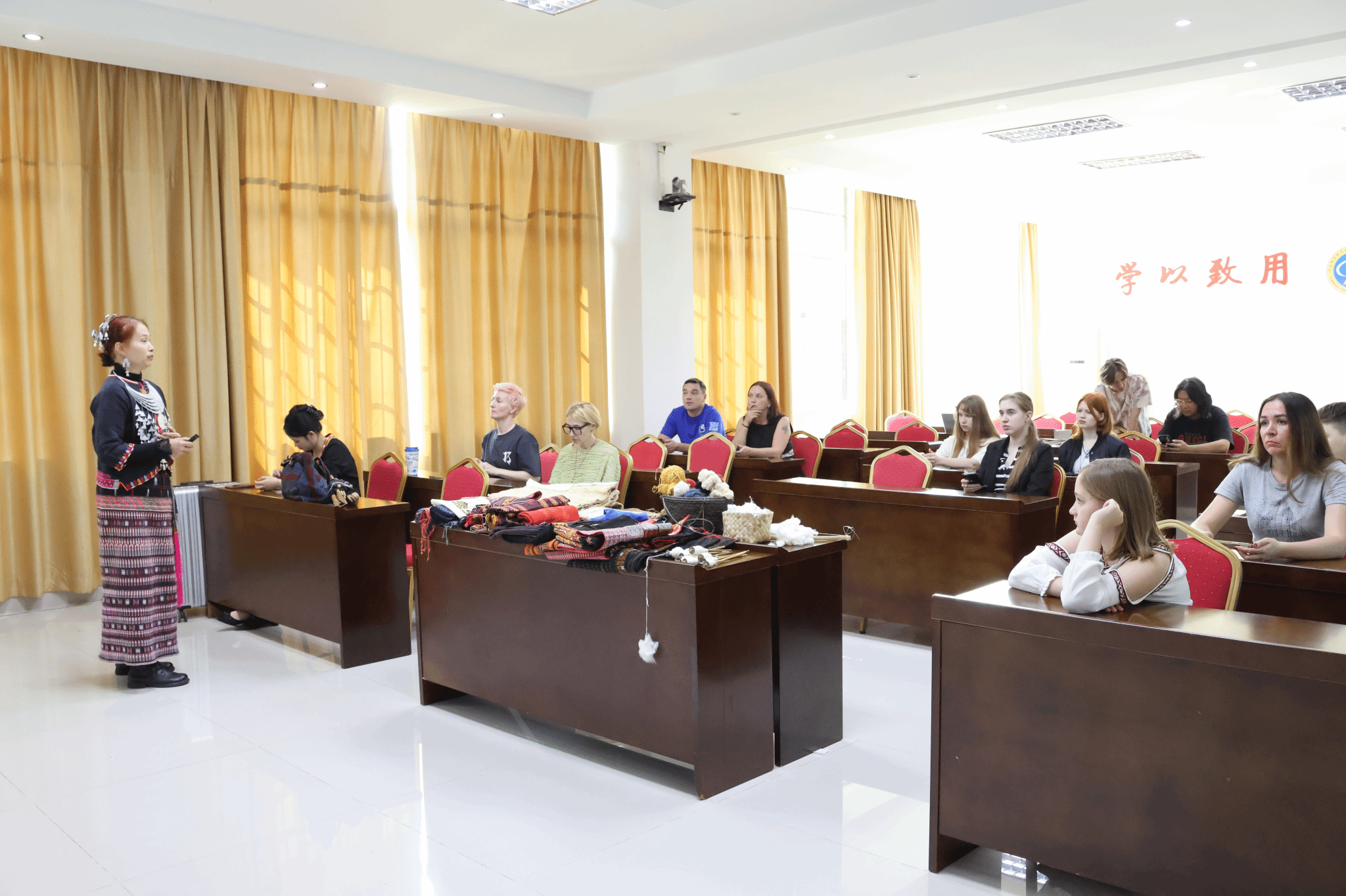为了让国际学员们更加直观地感受非遗技艺的魅力,陈丹老师还亲自示范了纺线技艺,并邀请学员们参与互动体验。在陈丹老师的指导下,学员们纷纷动手尝试,感受着传统技艺的奇妙与独特。同时,现场还展示了精湛的织锦技艺,赢得了国际友人们的阵阵掌声和高度赞誉。