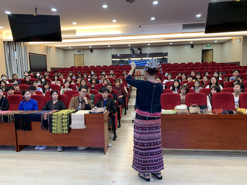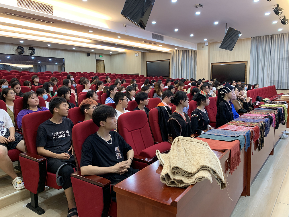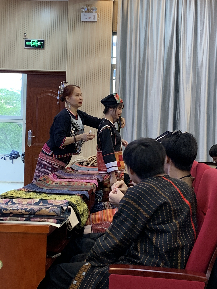 陈丹老师通过理论授课、实物展示、学生亲身体验的方式,从黎锦服饰的原材料、黎族五大方言服饰特色、黎族图腾含义、纺染织绣技艺、黎锦与现代时尚生活等方面讲解了黎锦服饰与纺染织绣相关知识。