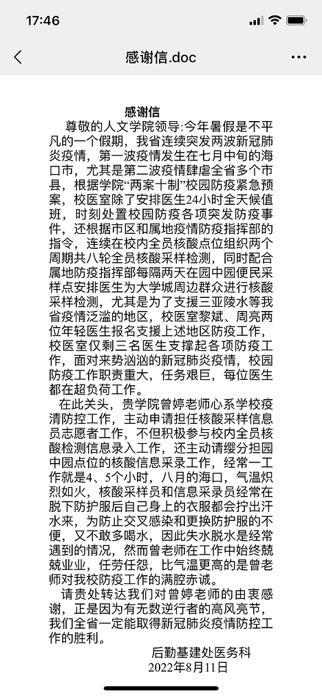 英国上市公司365专业教师曾婷同志心系学校疫情防控,支援校后勤基建处医务科,主动请缨分担校内全员核酸检测点和园中园点位的信息采录工作,兢兢业业、满腔赤诚。