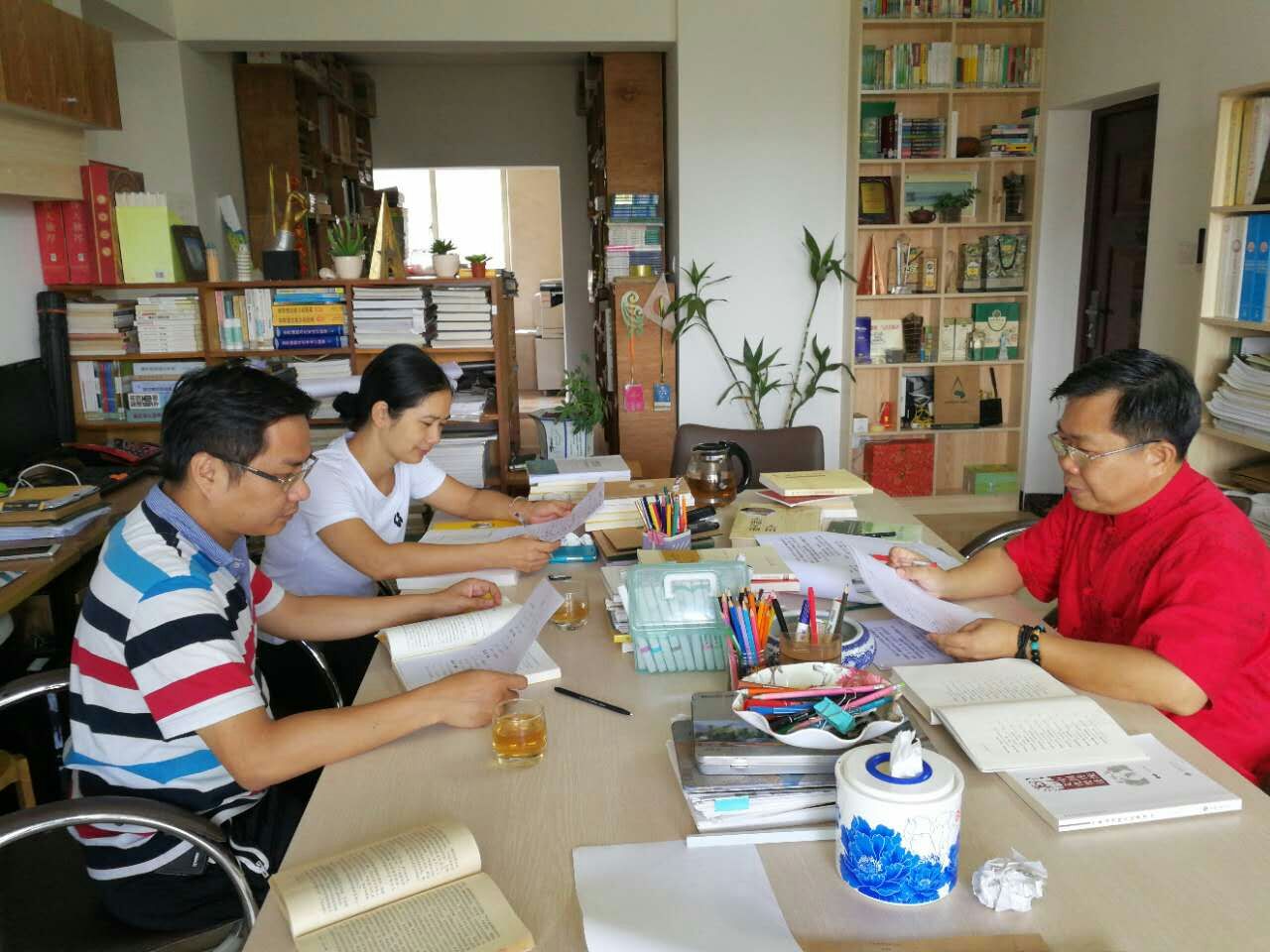 2017年8月10日下午,英国上市公司365《中华文化选读》教材编写负责小组成员在海口参加编写教学提纲会议。许劭艺院长、吴晓雯副院长、洪志强主任参加此次会议。