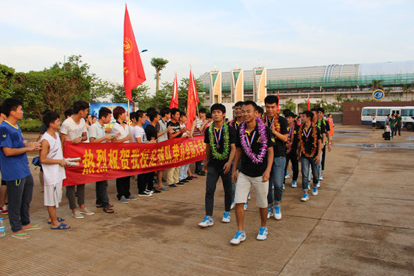 下午5时许,徐畅副书记以及公共教学部主要负责人来到美兰机场,迎接从西宁返程的足球队员。当队员们坐着校车缓缓驶入校园,一个巨大的惊喜在等待着他们:张继友书记以及100多位同学为他们举行了简短而热烈的欢迎仪式。大家高举着横幅,挥舞着彩球,欢呼着,跳跃着,向英雄们献上彩带。在同学们的掌声和欢呼声中,张继友书记代表全校师生对载誉归来的校足球队表示热烈祝贺,并与领队赵少雄、教练员及每位足球健儿一一握手,感谢他们的艰辛付出。张书记对足球队的杰出表现给予了高度评价。他说,我校足球队获得了大足赛季军,创造了海南省高校足球队参加全国大赛的最好成绩;队员们在比赛中发扬了顽强拼搏、奋勇争先的精神,是学校的骄傲,是海南的骄傲!他希望队员们继续保持昂扬的斗志和良好的状态,发挥好榜样作用,带动更多人参与到足球运动中。