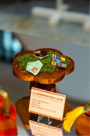 此次参展的服装与配饰作品品类丰富多样,涵盖黎锦元素系列成衣、黎锦双面绣创意首饰、雕刻工艺首饰等多个领域。学生们以“黎族文化及黎锦美学”为灵感源泉,将课堂所学的设计理论、材料运用知识与创新思维深度融合,通过手工精心制作完成每一件作品。其中,21级服装与服饰设计2班的黄冰冰同学带来的《暮山似梦》系列黎族服饰创意成衣套装,宛如一幅流动的艺术画卷。该作品巧妙地将黎族黎锦染印工艺与现代服饰款式相结合,既保留了传统工艺的独特韵味,又融入了当代潮流元素,传递出黄冰冰同学对传统与现代融合的深刻思考与独特表达。23级服装1班的麦嘉怡同学设计的《黎族双面绣胸针饰品套装》,则是对传统工艺的创新演绎。她以黎族非遗双面绣工艺为基础,巧妙运用珠片、刺绣等装饰技法,将传统与现代完美融合,展现出独特的艺术魅力。