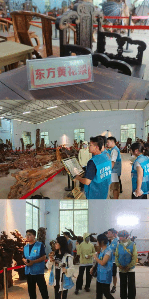 东方自然瑰宝园是自然与艺术交融之地,也是展示东方市特色林业资源的重要窗口。在解说员引导下,研学团首先走进根雕展览馆。馆内,黄花梨、沉香木、金丝楠木等名贵树种雕刻而成的艺术品琳琅满目,或似山水,或像人物,每一件都凝聚着工匠的精湛技艺与奇思妙想。细腻纹理在灯光下流转,生动造型仿佛诉说着自然与人文故事,同学们驻足观赏、连连惊叹,深深被工匠将天然木料的特质与艺术创意完美融合的高超技艺折服。