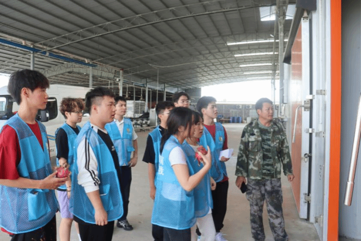 随后,厂长带领研学团参观火龙果选果机器,详细讲解其工作原理,从果实大小筛选、糖分检测到品质分级,每个环节都彰显现代科技在农业生产中的应用。在火龙果冷库,厂长介绍,冷库采用先进温控技术,能精准控制温湿度,有效延长火龙果保鲜期。从果实入库到通过冷冻运输车运往全国乃至出口海外,整个流程都有严格标准与规范,确保消费者品尝到新鲜优质的火龙果。